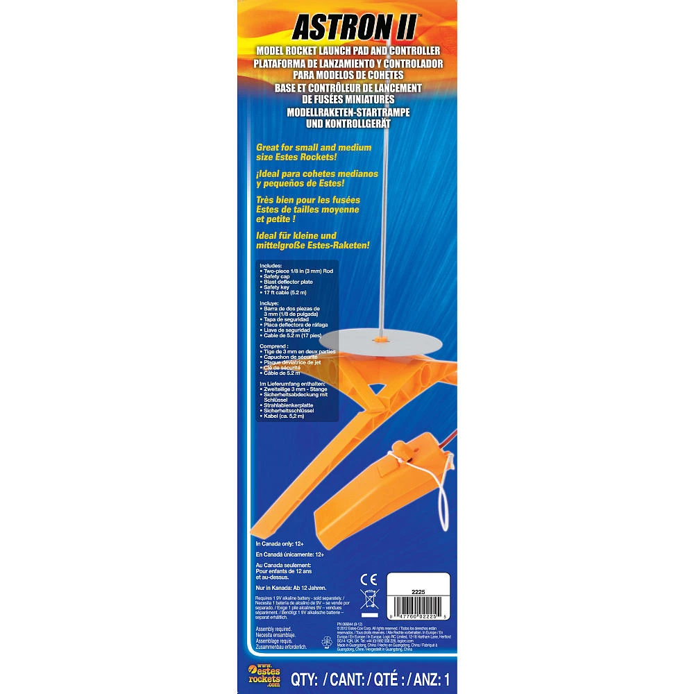 Get the newest launch system Estes offers! And save some money too! Available now as a set. Fully assembled Astron II Launch Controller (requires one 9V alkaline battery – not included) and Astron II Launch Pad (minor assembly required). Fully assembled controller with 17 ft. of cable. Includes safety key. Blast shield included. Instructions. Launch pad accommodates our 1/8″ (3 mm) launch rod.