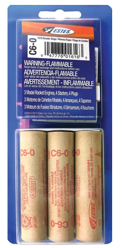 The Estes C6-0 engine is a booster stage engine designed for model rocket flight and has to be used with a standard engine. This engine is for flights in rockets weighing less than 4 ounces, including the engines.
