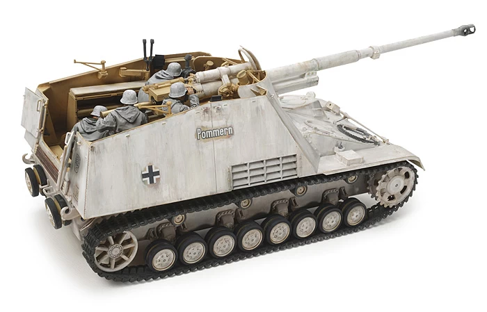 This is a highly detailed model of the WWII German tank destroyer Nashorn. The full size vehicle featured an 8.8cm gun also known as a PAK 43 and it was fitted to the upper surface of a light turret less chassis. Even though the vehicle was lightly armored, the PAK43 weapon was capable of penetrating 190mm of armor at 1,000 meters. The Nashorn saw action with German heavy antitank battalions fighting Soviet and Allied forces during much of the conflict. Due to its relatively low cost and superior mobility compared to heavier tanks it remained in production until the end of the WWII war.