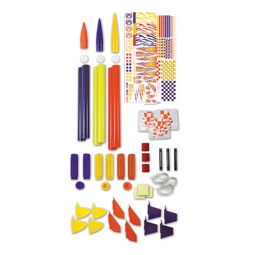 Oh what fun you’re going to have! Enough parts to build 3 colorful rockets! All parts are pre-colored so you won’t need any paint! 2 huge self-stick decal sheets lets you be the “creative designer”.