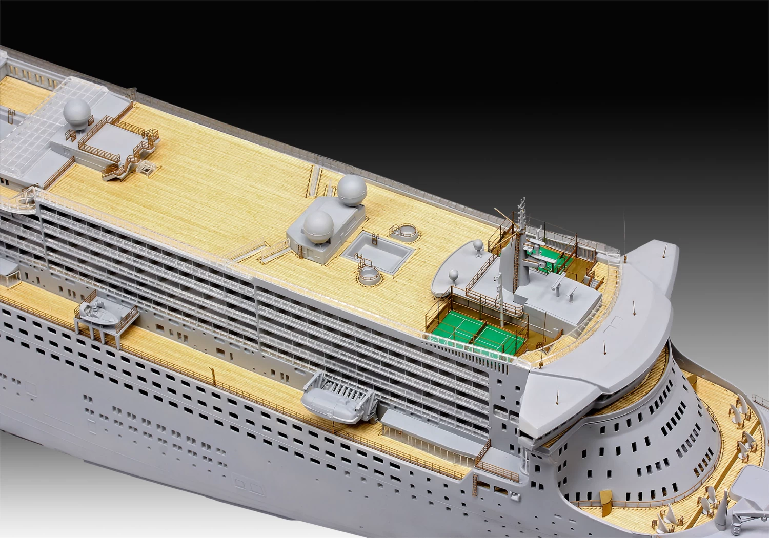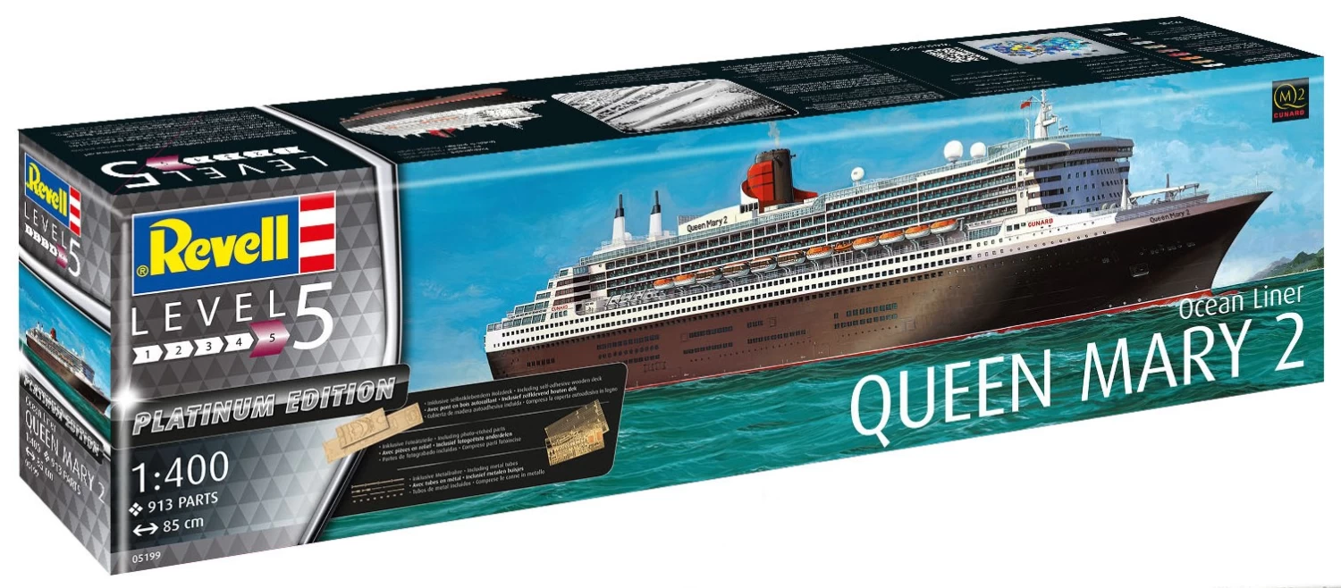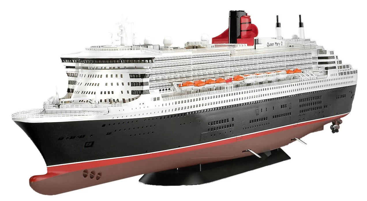 Model kit of the impressive Queen Mary 2, a superlative cruise ship. The ship offers luxury on a length of 345 meters for more than 2,500 passengers.