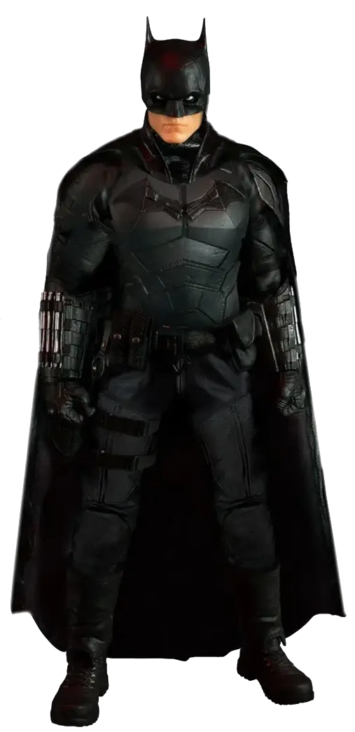 The Batman is outfitted in a screen-accurate armored Batsuit with chest insignia. The costume features an integrated posing wire in the cape, utility belt, a thigh pouch, and two vambrace. Batman comes complete with four head portraits including an unmasked Bruce Wayne portrait, all featuring the likeness of actor Robert Pattinson.
