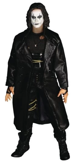 The One:12 Collective The Crow features four head portraits with various expressions including surprised, teeth-gritting, smirking, and standard sculpts. The supernatural avenger is outfitted in a black shirt, leather-like pants, leather-like overcoat, and wears his fiancée’s engagement ring around his neck in her memory.