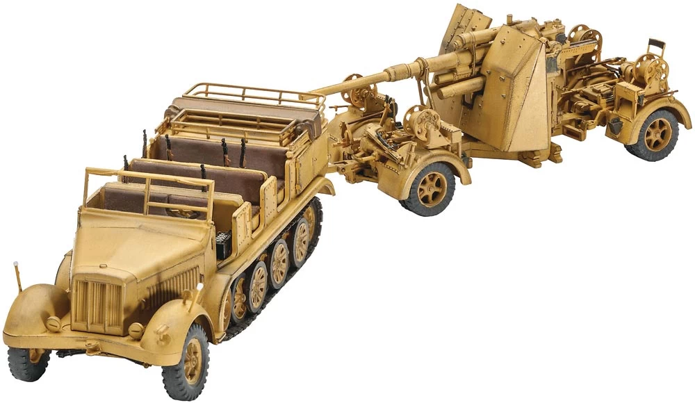 The Sd.Kfz. 7 half track was the ultimate Prime mover of WWII. It was fully capable of hauling the vaunted 88mm Flak 37, its crew, and a whole lot of ammunition. Once in position, it took a veteran gun crew mere minutes to set up an 88 for firing. Their artillery piece was one of the most lethal weapons ever created-capable of taking out armor, infantry, aircraft. . . virtually anything. Kit features choice of gun shields and barrels, optional action or transport positions, specialized trailer, and two sets of decals.
